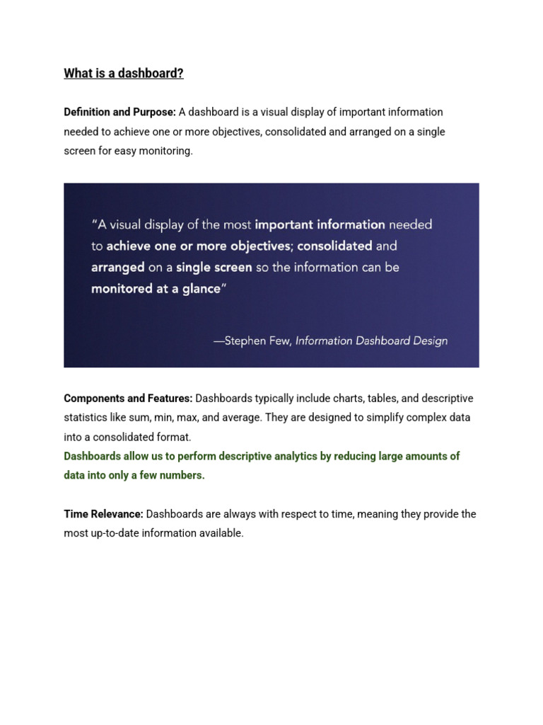 Definition and Purpose: A dashboard is a visual display of important information