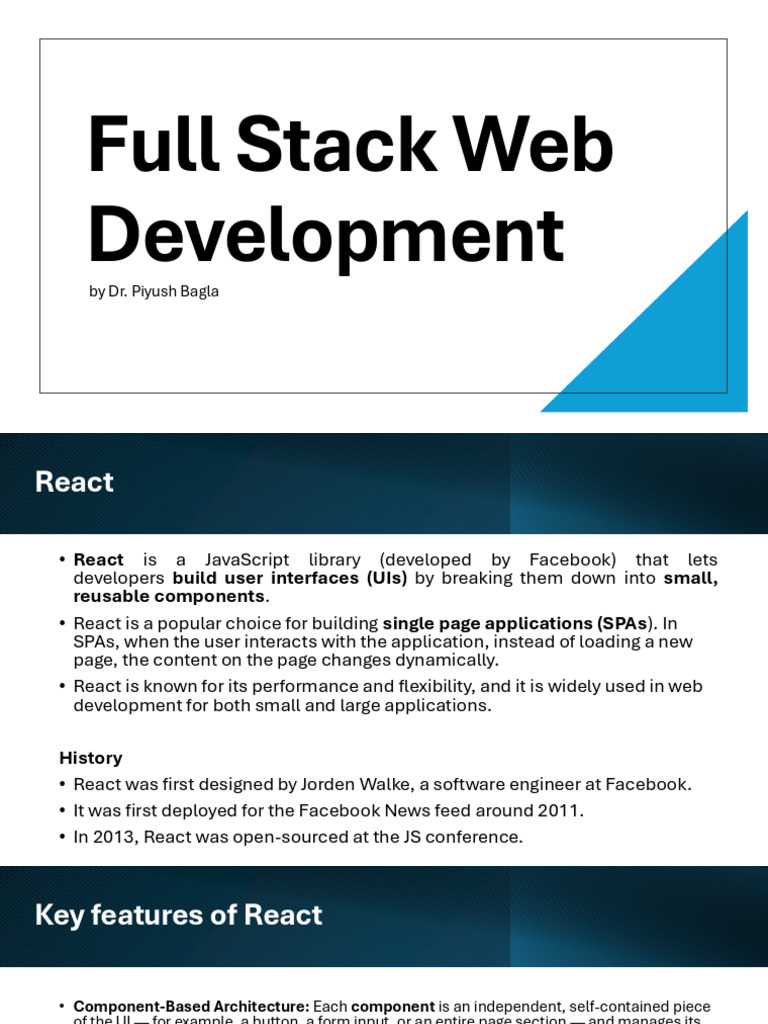 • React is known for its performance and flexibility, and it is widely used in web