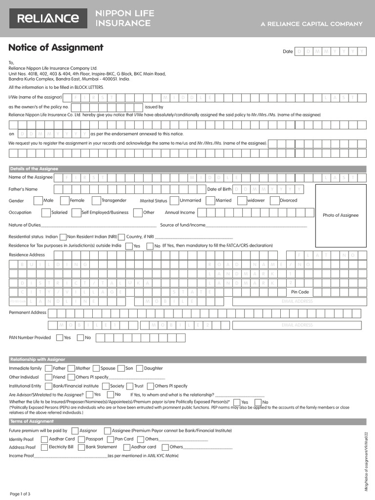 Reliance Nippon Life Insurance Co. Ltd. hereby give you notice that I/We have absolutely/conditionally assigned the said policy to Mr./Mrs./Ms. (name of the assignee)