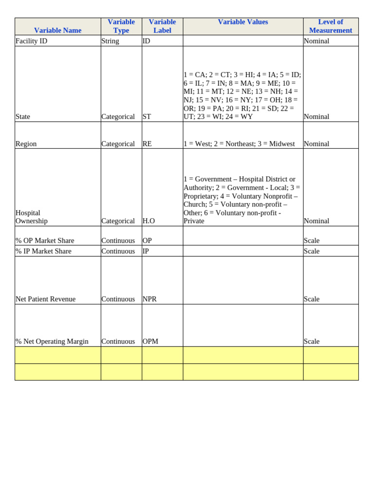 Region Categorical RE 1 = West; 2 = Northeast; 3 = Midwest Nominal