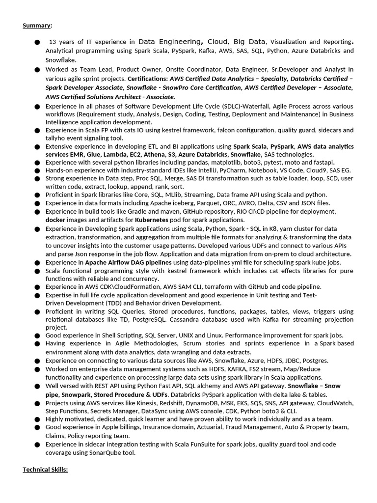 ● Extensive experience in developing ETL and BI applications using Spark Scala, PySpark, AWS data analytics