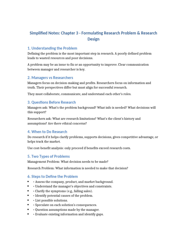 Simplified Notes: Chapter 3 - Formulating Research Problem & Research