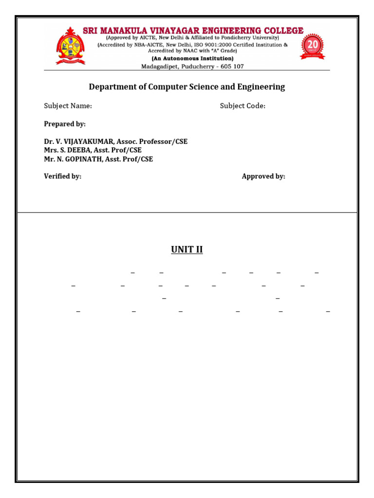 SRI MANAKULA VINAYAGAR ENGINEERING COLLEGE Dept of CSE
