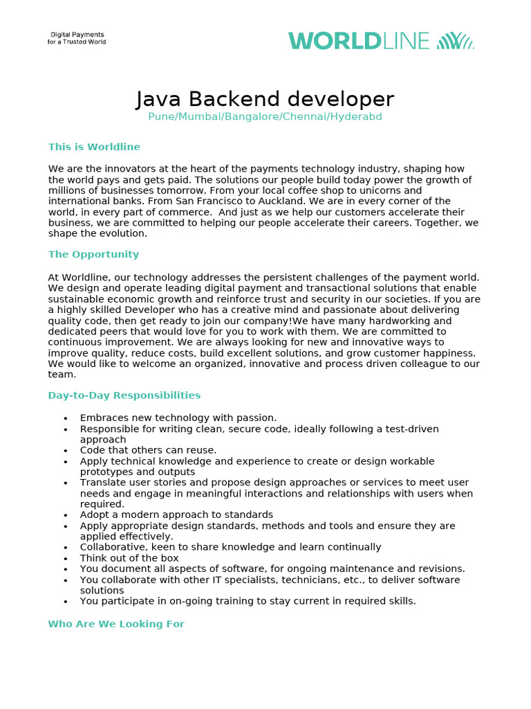 Java JEE, Spring boot, JSP, JMS (ActiveMQ), Open API, Angular (good to have)