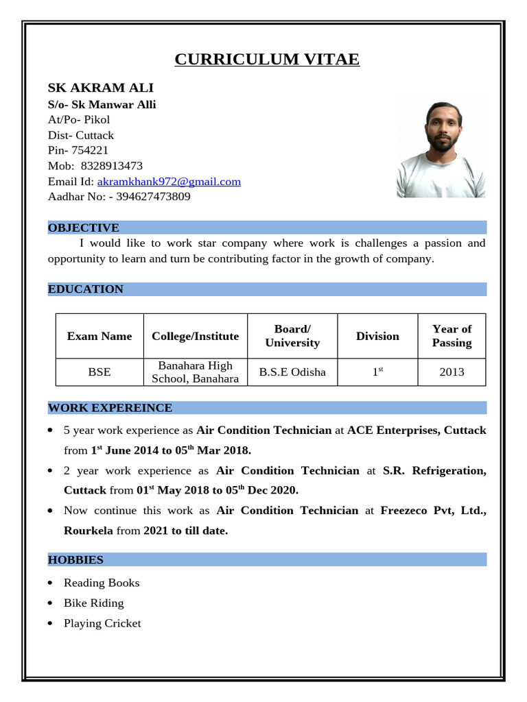 5 year work experience as Air Condition Technician at ACE Enterprises, Cuttack