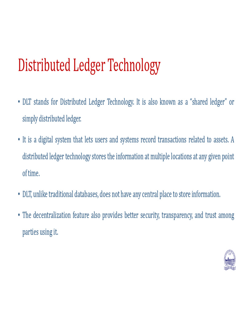 • DLT, unlike traditional databases, does not have any central place to store information.
