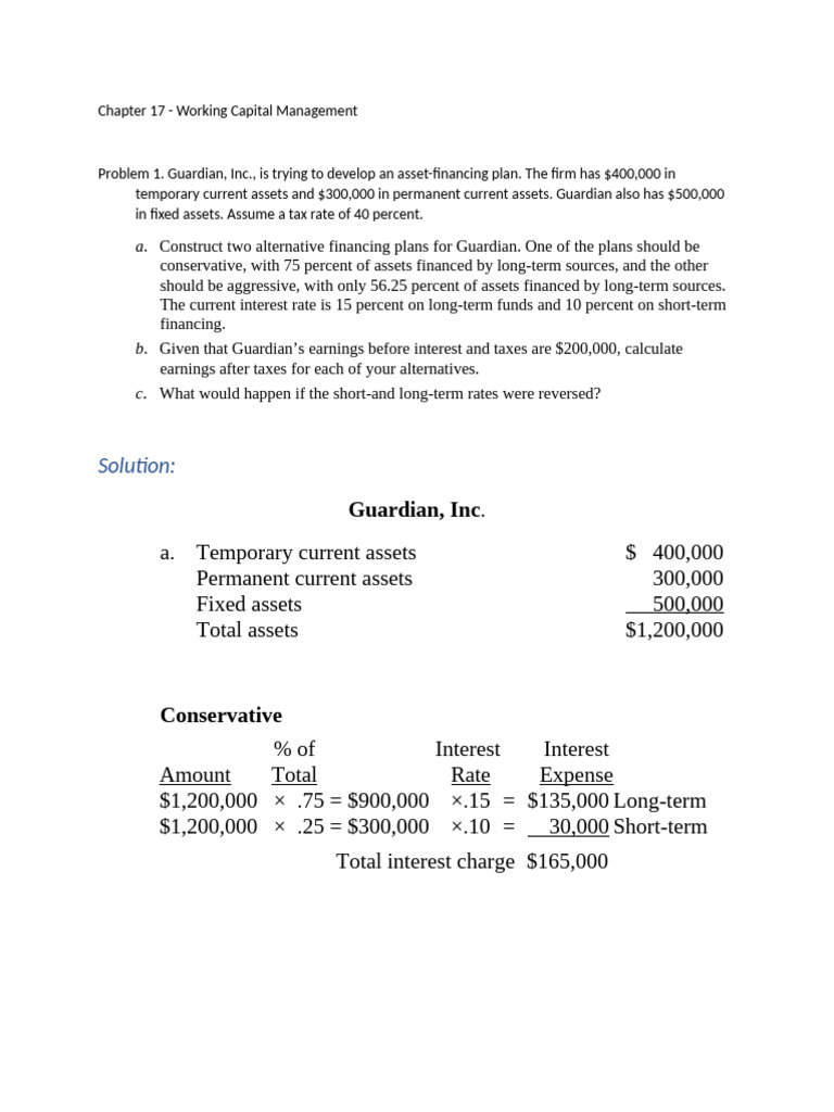 Problem 1. Guardian, Inc., is trying to develop an asset-financing plan. The firm has $400,000 in