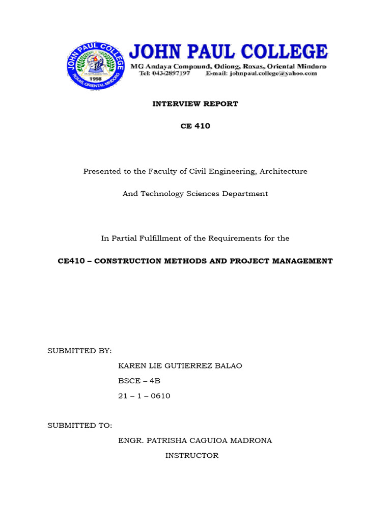 CE410 – CONSTRUCTION METHODS AND PROJECT MANAGEMENT