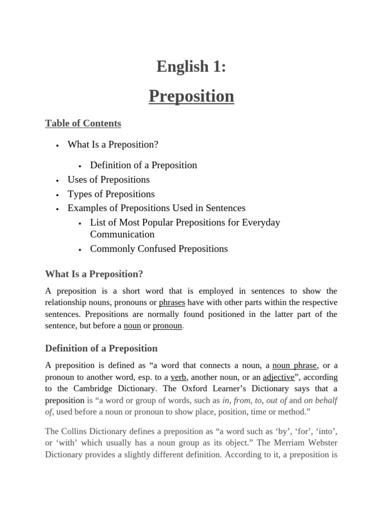 A preposition is defined as “a word that connects a noun, a noun phrase, or a