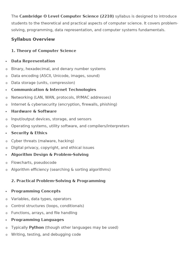 The Cambridge O Level Computer Science (2210) syllabus is designed to introduce