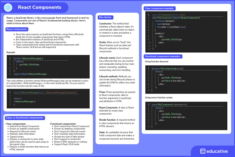 • Come in two types: class and functional components. Hooks: Allow you to "hook" into 10 </div>