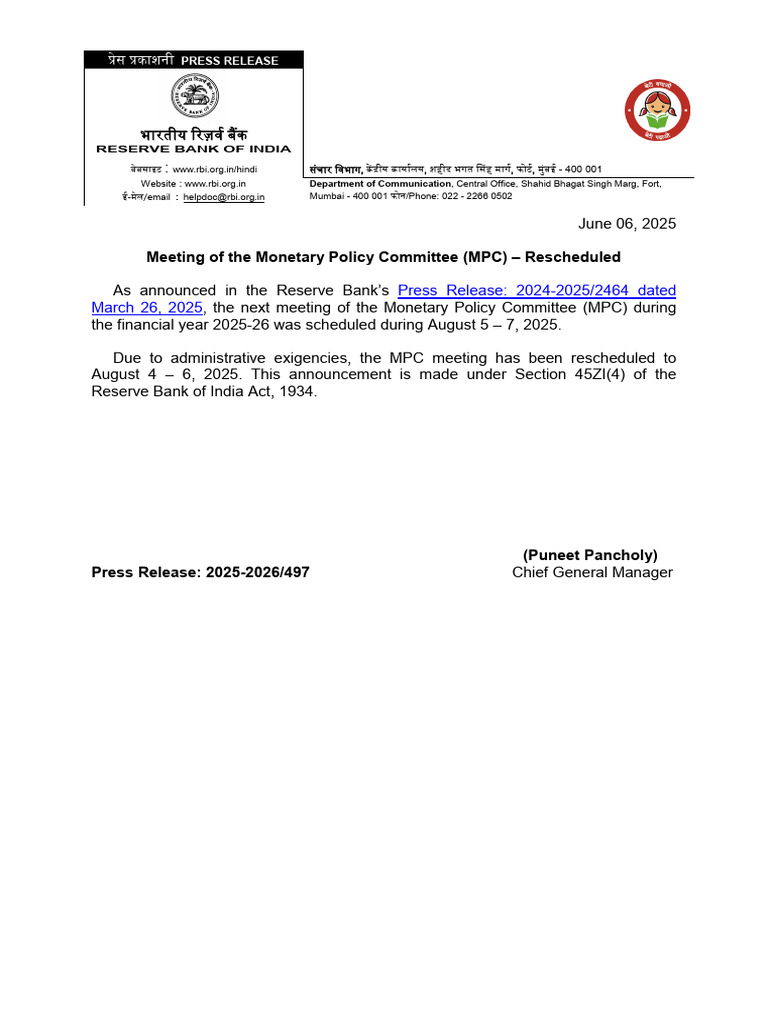 Due to administrative exigencies, the MPC meeting has been rescheduled to