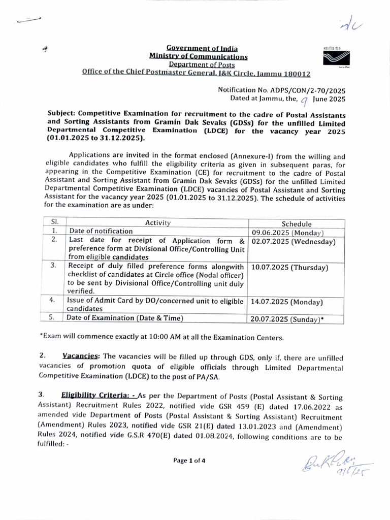 Departmental Competitive Examination (LDCE) vacancies of Postal Assistant and Sorting