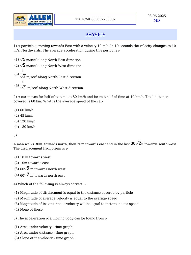 1) A particle is moving towards East with a velocity 10 m/s. In 10 seconds the velocity changes to 10