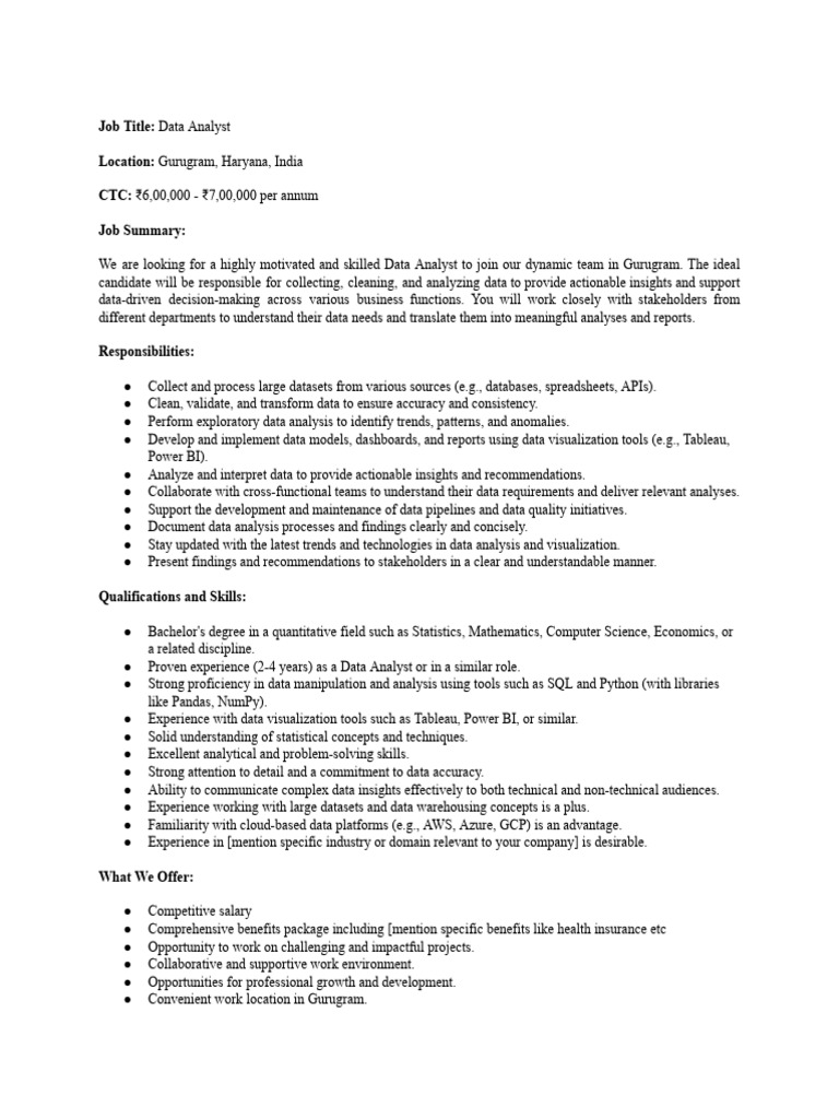 We are looking for a highly motivated and skilled Data Analyst to join our dynamic team in Gurugram. The ideal