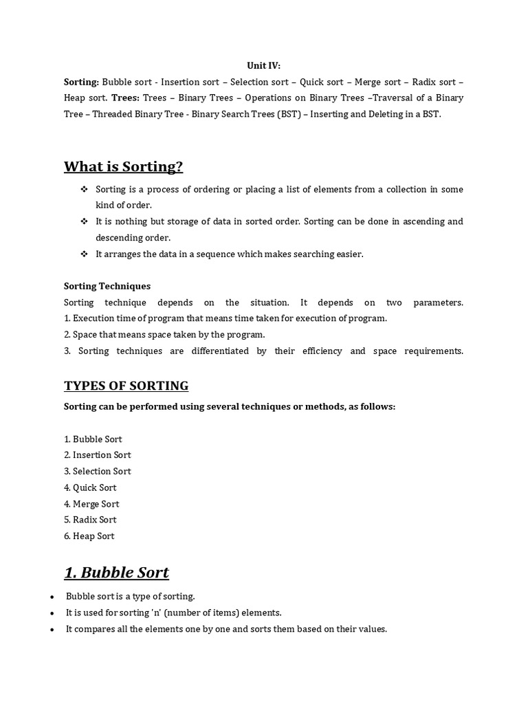 Sorting: Bubble sort - Insertion sort – Selection sort – Quick sort – Merge sort – Radix sort –