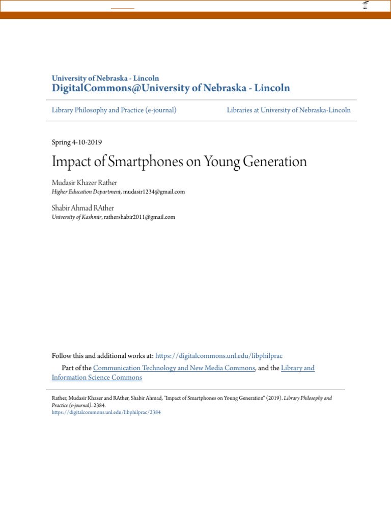 Rather, Mudasir Khazer and RAther, Shabir Ahmad, "Impact of Smartphones on Young Generation" (2019). Library Philosophy and