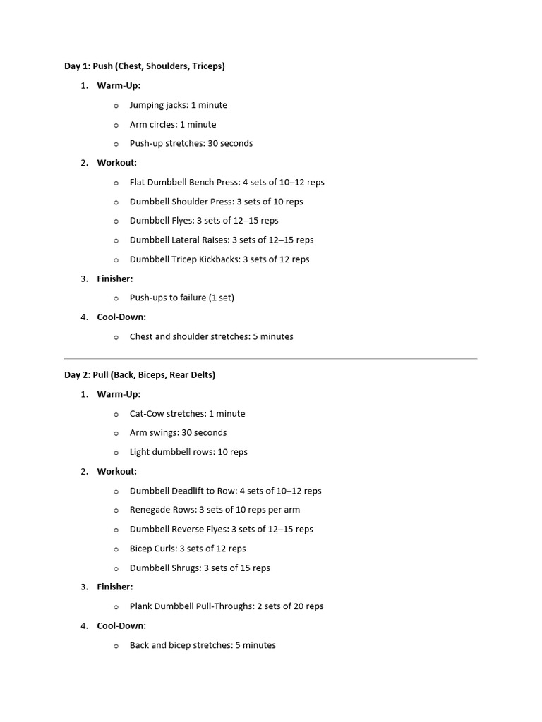 o Flat Dumbbell Bench Press: 4 sets of 10–12 reps