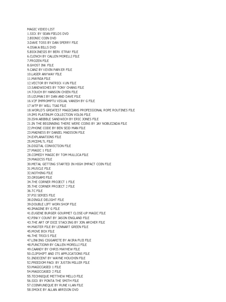 59.DANIEL GARCIA 1 DVD 60.DANIEL GARCIA 2 DVD 61.DANIEL GARCIA 3 DVD 62,DANIEL GARCIA 4 FILE 63.DANIEL GARCIA 5 FILE 64.DANIEL GARCIA 6 FILE 65.MISC FILE 66.MORGANS METAL LIQUID FILE 67.PATRICK KUN CENTER POINT FILE 68.PERFOMANCES FILE 69.RIZER FILE 70.T11 INFLIGHT DM FILE 71.WAYNE HOUCHIN CONTROL 2.0 FILE 72.THE WERM BY DAN AND DAVE FILE 73.DINNER MAGIC FILE 74.GENESIS VOL 1 BY ANDREI JIKH FILE 75.HOW TO DO STREET MAGIC FILE 76.WITNESS BY LEE ASHER FILE 77.NINJA1 FILE 78.NINJA2 FILE 79.THE HAWK 2.0 BY ALEXENDER KOELLE FILE 80.WINDOW BY DAVID STONE FILE 81.XTREME BEGINNERZ VOL 1 FILE 82.ULTIMATE CARD THROUGH WINDOW FILE 83.MAGIC ANTHONY JACQUIN COLLECTION FILE 84.ECLIPSE BY ERIC JONES FILE 85.STEALING PIPS THE CARD MAGIC BY OZ PEARLMAN FILE 86.ONE HAND TOP PALM BY ALEX LINIAN FILE 87.TOP BY ALEX PANDREA FILE 88. DAVID STONE REAL SECRETS OF MAGIC VOL1 FILE 89.DAVID STONE REAL SECRETS OF MAGIC VOL2 FILE 90.DEVO RING FILE 91.WATERMARK BY MATHIEW BICH FILE 92.BLINDSIDED BY OZ PEARLMAN FILE 93.THE RAVEN DVD 94.CRASH COURSE DVD 95.BUISNESS CARD DVD 96.TARANTULA DVD 97.COIN MASTER DVD 98.PK RING DVD 99.PAPERCUTS FILE 100.THE MIRROR FACE BY PATRICK KUN FILE 101.SURGE BY PATRICK KUN FILE 102.PAUL FILE 103.DECEPTIONS BY RICK MAUE FILE 104.SPELLO CHANGE BY JESSE FEINBERG FILE 105.TALK ABOUT TRICK LIGHT VERSION BY JOSHUA JAY FILE 106.FREE FALL BY ANDREW MAYNE FILE 107.REALITY IN PLASTIC ANTHONY JACQUIN FILE 108.BAND SHARK FILE 109.PROFESSIONAL GUIDE TO FIRE EATING BY BRIAN BRUSHWOOD FILE 110.BRICK PASS FILE 111.DMB SPREAD CONTROL BY DAN AND DAVE FILE 112.OPEN TRIUMPH BY DANI DA ORTIZ FILE 113.FOOLERS DOOLERS BY DARYL VOL3 FILE 114.DECEPTION BY DAVE FOREST VOL1 FILE 115.CONSPIRACY BY ERIC JONES DVD 116.LOOPS BY DANIEL GARCIA DVD 117.PIXEL BY DAVID JADE DVD