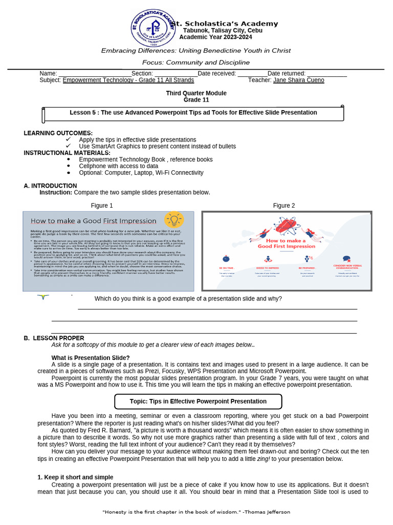 II. Instruction. Keep in mind the tips in slide presentations, sketch a 3-slide presentation on each topic below.
