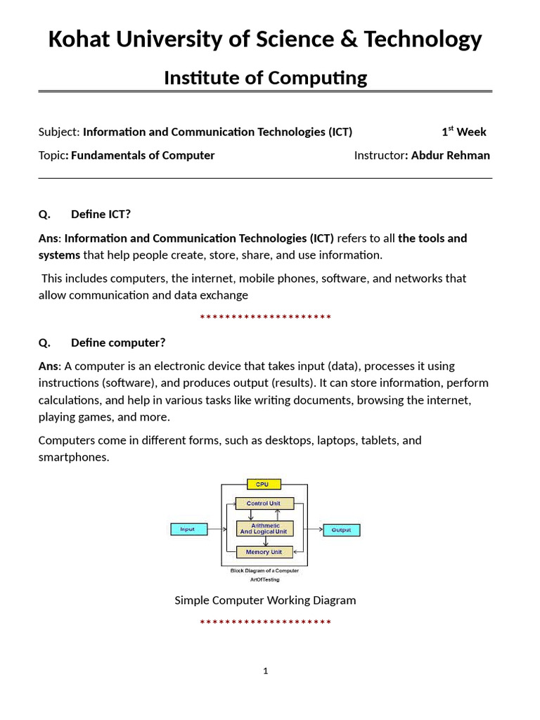 Subject: Information and Communication Technologies (ICT) 1st Week