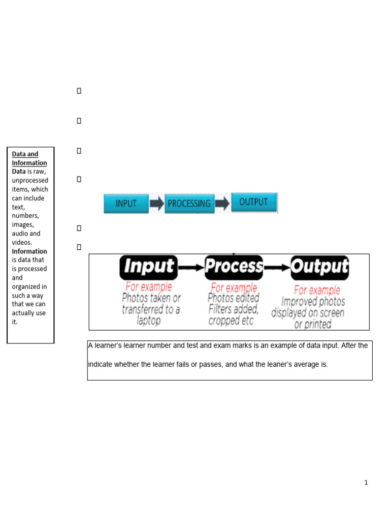 A learner’s learner number and test and exam marks is an example of data input. After the