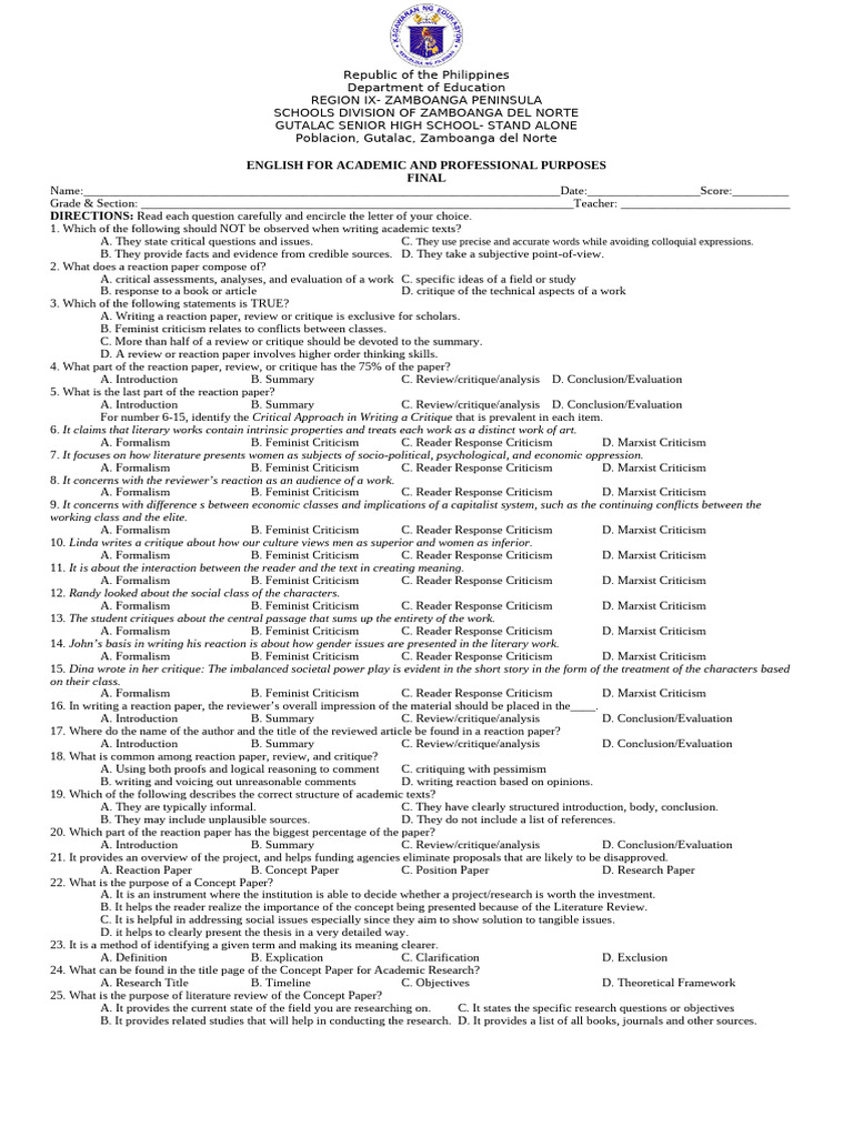 A. Reaction Paper B. Position Paper C. Concept Paper D. Research Paper