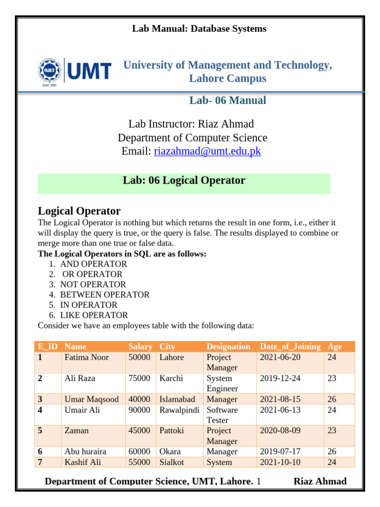 Department of Computer Science, UMT, Lahore. 7 Riaz Ahmad