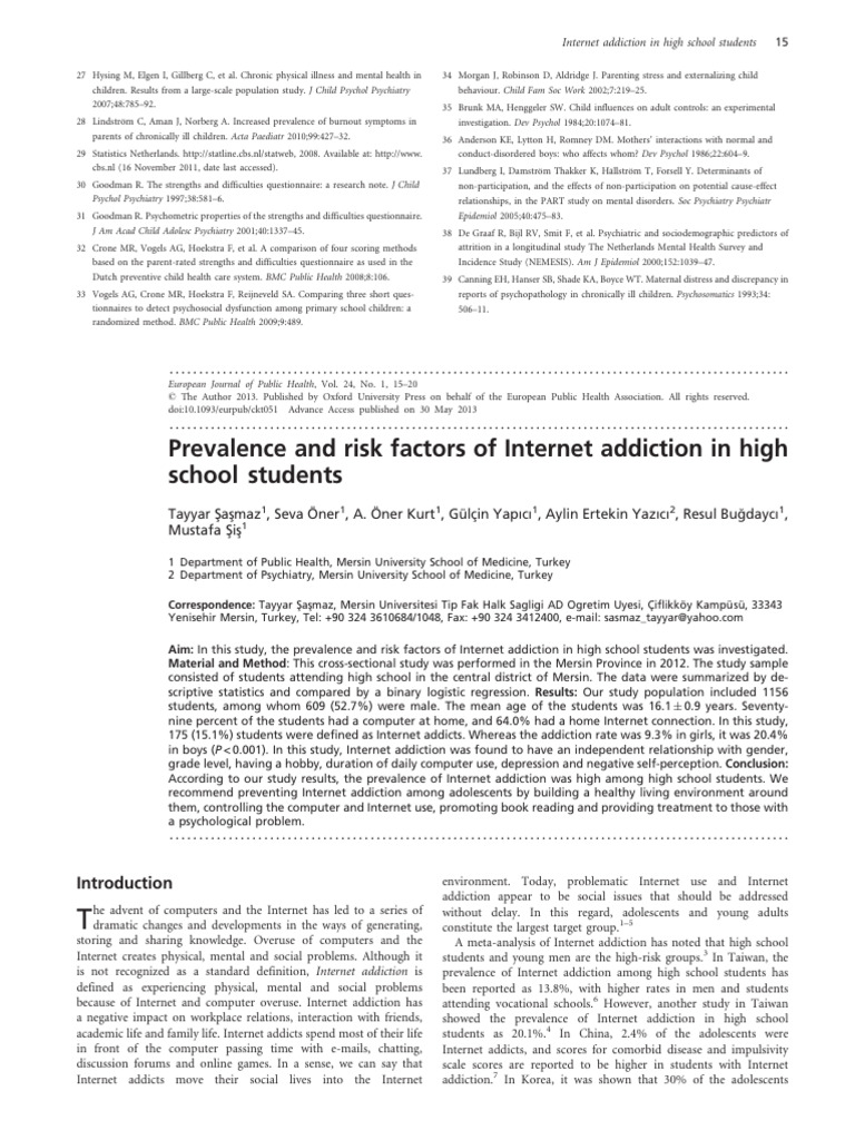 internet addiction and online activities in adolescents. J Adolesc Health 2009;44: Eur J Pediatr 2009;168:655–65.
