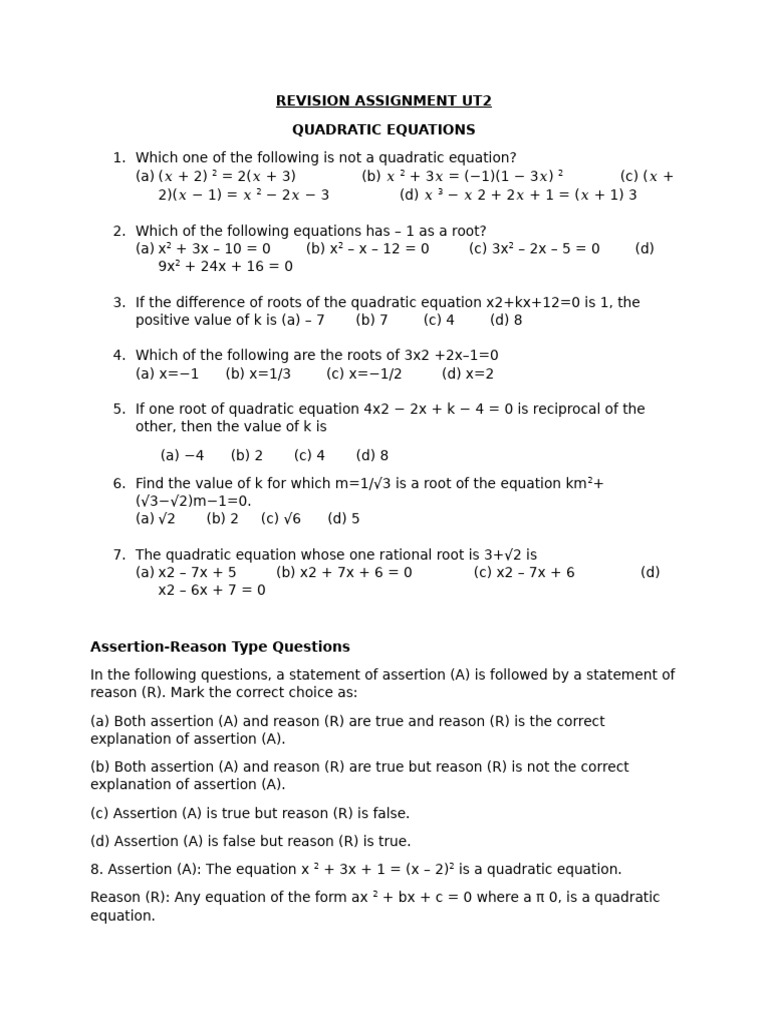 8. Assertion (A): The equation x + 3x + 1 = (x – 2)2 is a quadratic equation.