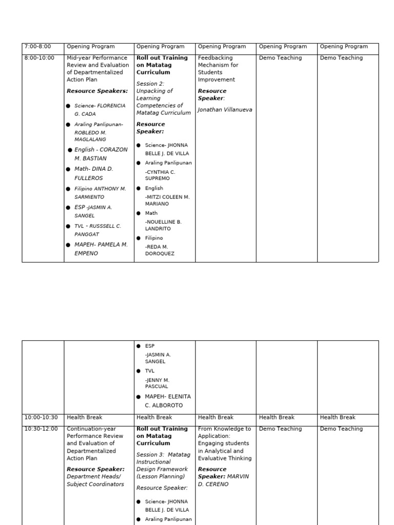8:00-10:00 Mid-year Performance Roll out Training Feedbacking Demo Teaching Demo Teaching