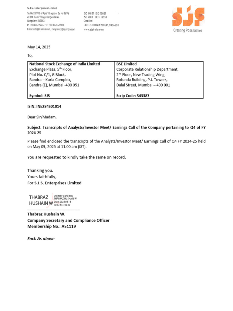 Q4 FY25 Conference Call of SJS Enterprises Limited.