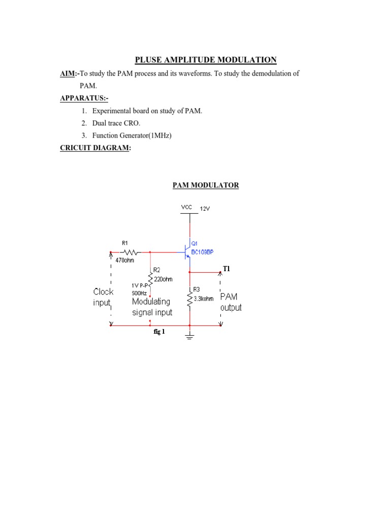 AIM:-To study the PAM process and its waveforms. To study the demodulation of PAM. APPARATUS:1. Experimental board on study of PAM. 2. Dual trace CRO. 3. Function Generator(1MHz) CRICUIT DIAGRAM: