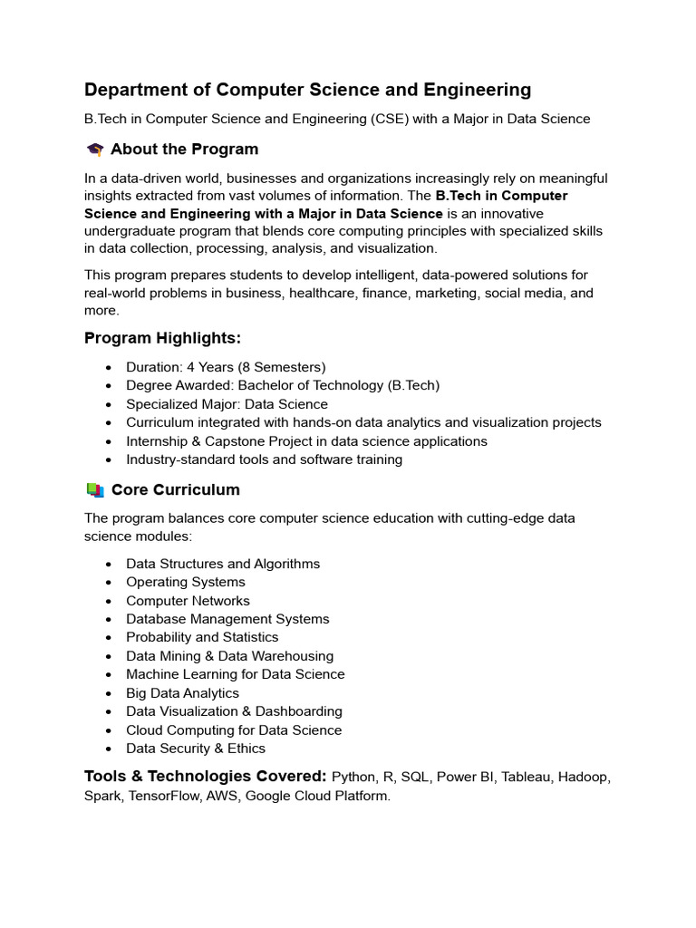 B.Tech in Computer Science and Engineering (CSE) with a Major in Data Science