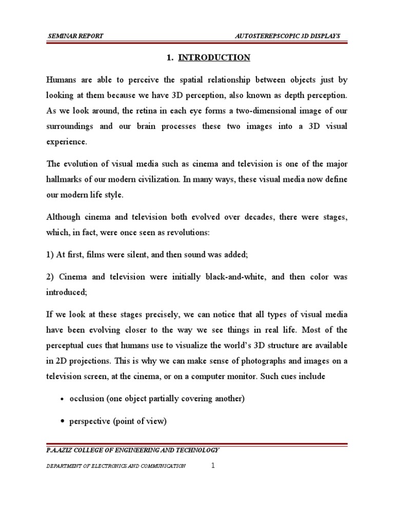1. INTRODUCTION Humans are able to perceive the spatial relationship between objects just by looking at them because we have 3D perception, also known as depth perception. As we look around, the retina in each eye forms a two-dimensional image of our surroundings and our brain processes these two images into a 3D visual experience. The evolution of visual media such as cinema and television is one of the major hallmarks of our modern civilization. In many ways, these visual media now define our modern life style. Although cinema and television both evolved over decades, there were stages, which, in fact, were once seen as revolutions: 1) At first, films were silent, and then sound was added; 2) Cinema and television were initially black-and-white, and then color was introduced; If we look at these stages precisely, we can notice that all types of visual media have been evolving closer to the way we see things in real life. Most of the perceptual cues that humans use to visualize the worlds 3D structure are available in 2D projections. This is why we can make sense of photographs and images on a television screen, at the cinema, or on a computer monitor. Such cues include