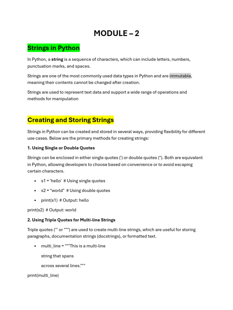 • Note: Concatenation using + creates a new string object, as strings are immutable.