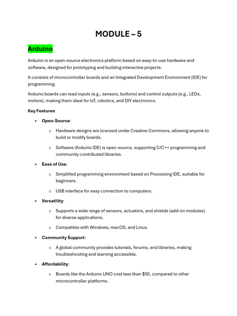 • Shields and Sensors: Add-on shields (e.g., WiFi, GPS) and sensors (e.g., ultrasonic,