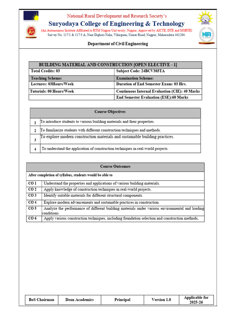 CO 1 Identify and classify various building materials based on their properties and applications.