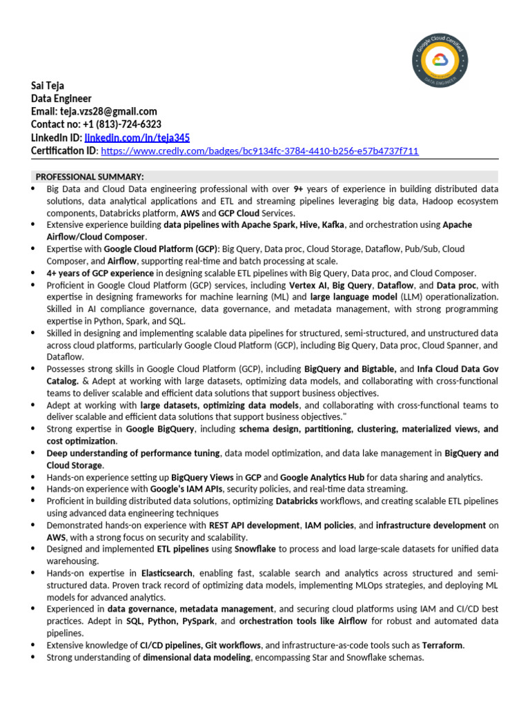 Possesses strong skills in Google Cloud Platform (GCP), including BigQuery and Bigtable, and Infa Cloud Data Gov