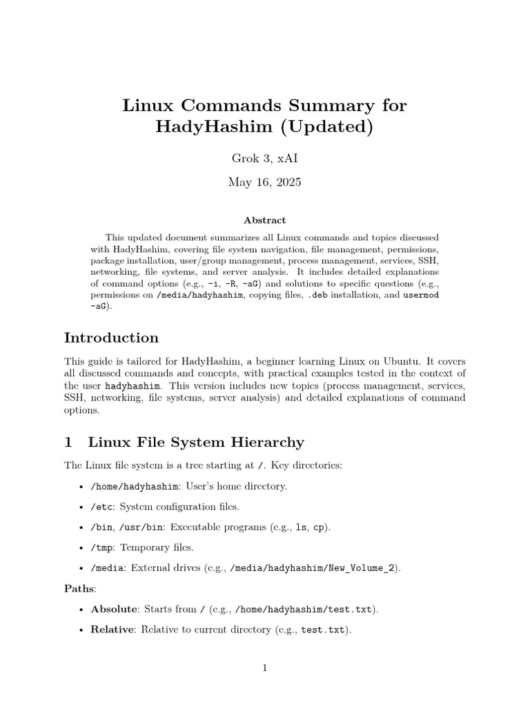 This guide is tailored for HadyHashim, a beginner learning Linux on Ubuntu. It covers
