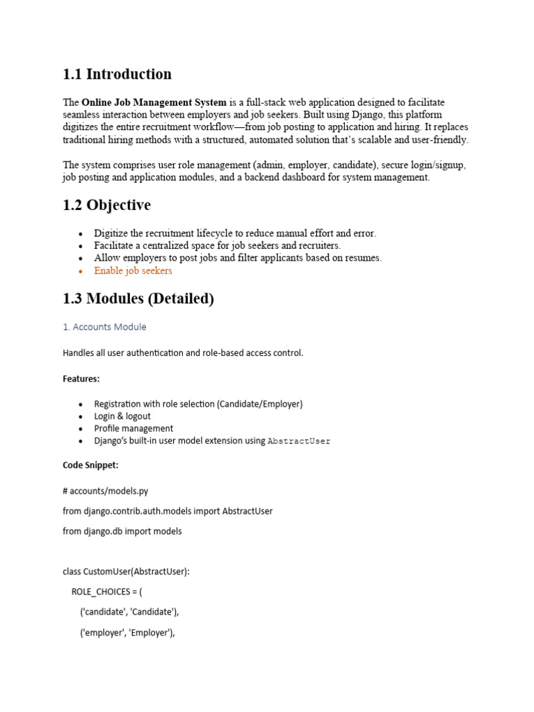 Django. It covers multi-role access, job interaction, and admin management. Its modularity