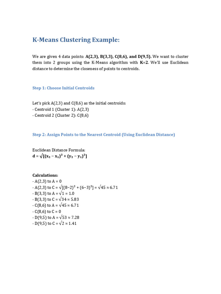 We are given 4 data points: A(2,3), B(3,3), C(8,6), and D(9,5). We want to cluster