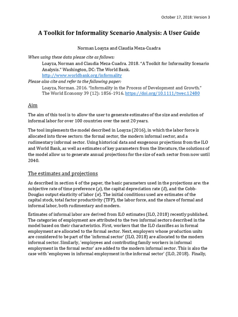 Loayza, Norman and Claudia Meza-Cuadra. 2018. “A Toolkit for Informality Scenario