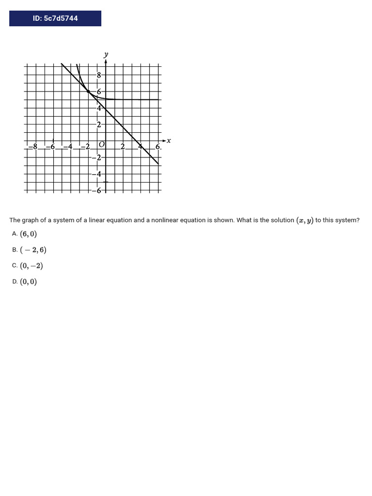 The graph of a system of a linear equation and a nonlinear equation is shown. What is the solution to this system?
