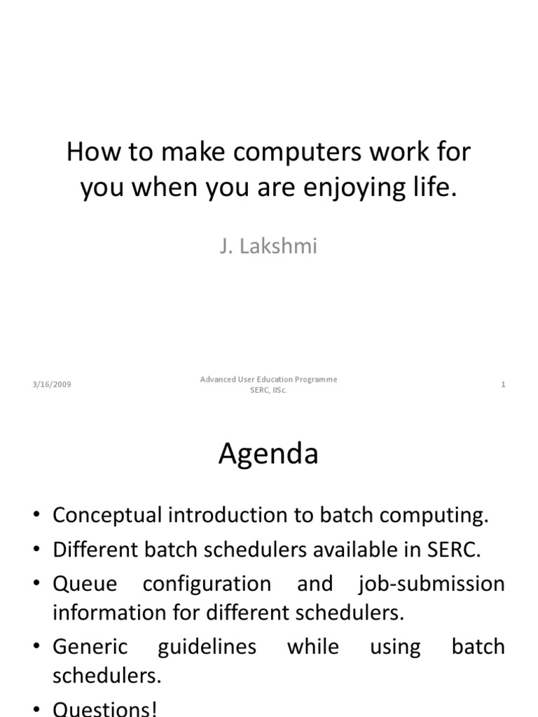 Conceptual introduction to batch computing. Different batch schedulers available in SERC. Queue configuration and job-submission information for different schedulers. Generic guidelines while using batch schedulers. Questions!