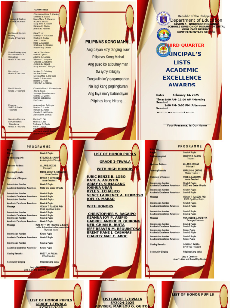 Message VEVIAN T. TUASON, PhD. WITH HONORS Academic Excellence Awardees - Grade 4 Pupils