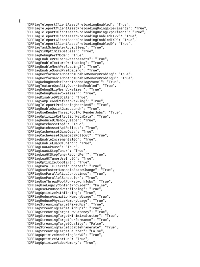 The document contains a comprehensive list of configuration flags and integer settings related to performance optimizations, rendering, asset preloading, and telemetry for a software application. Most flags are set to 'True', indicating that various features and enhancements are enabled to improve user experience and system efficiency. Additionally, there are specific integer settings that define limits and parameters for rendering, asset loading, and performance metrics.