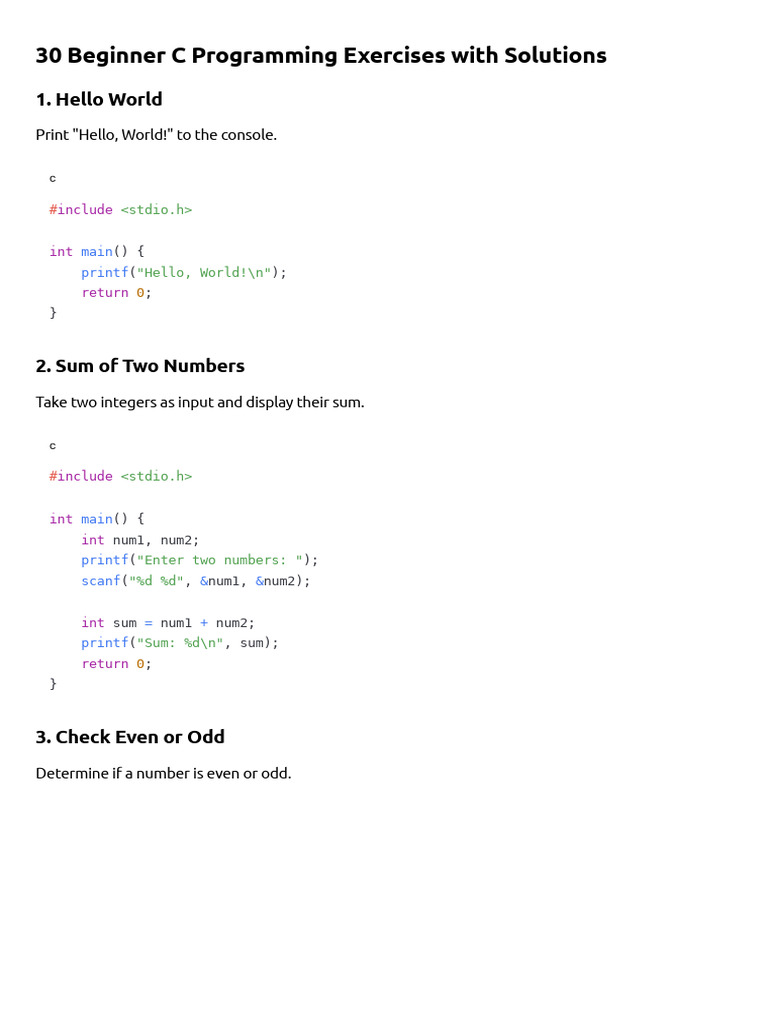 30 Beginner C Programming Exercises with Solutions