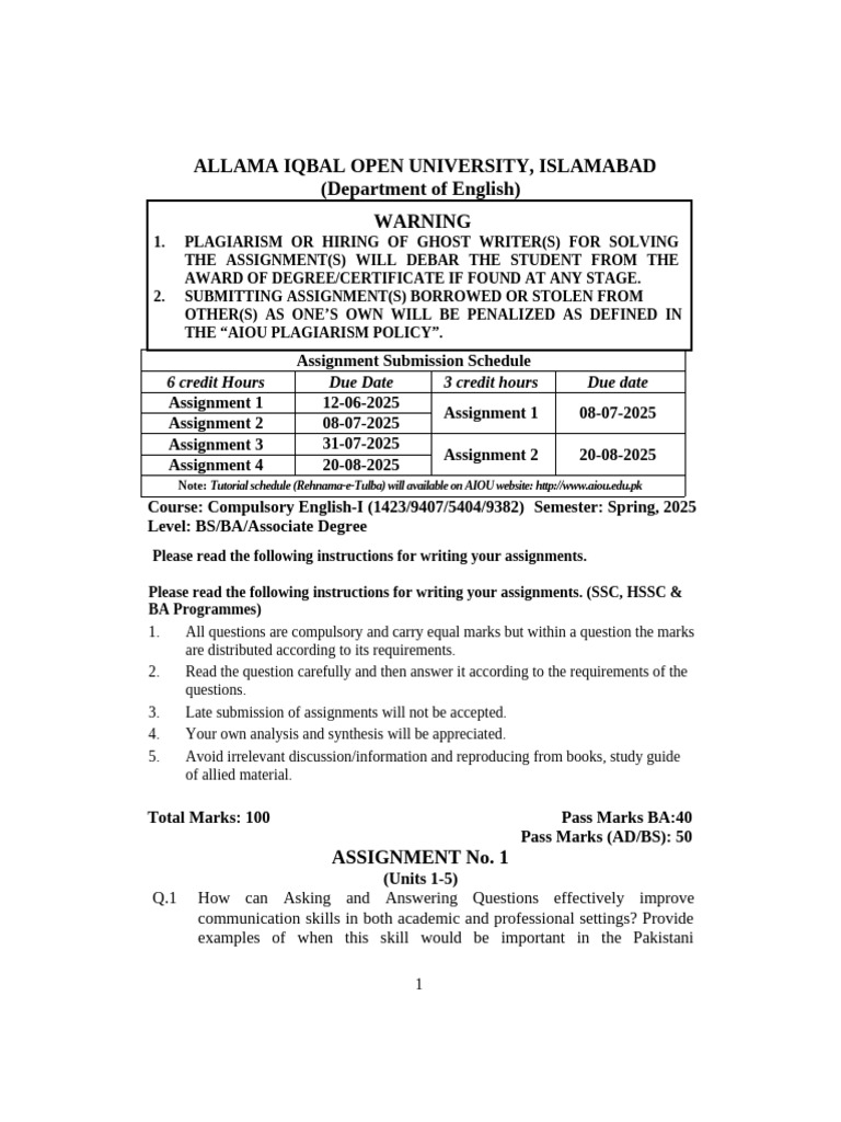 Course: Compulsory English-I (1423/9407/5404/9382) Semester: Spring, 2025