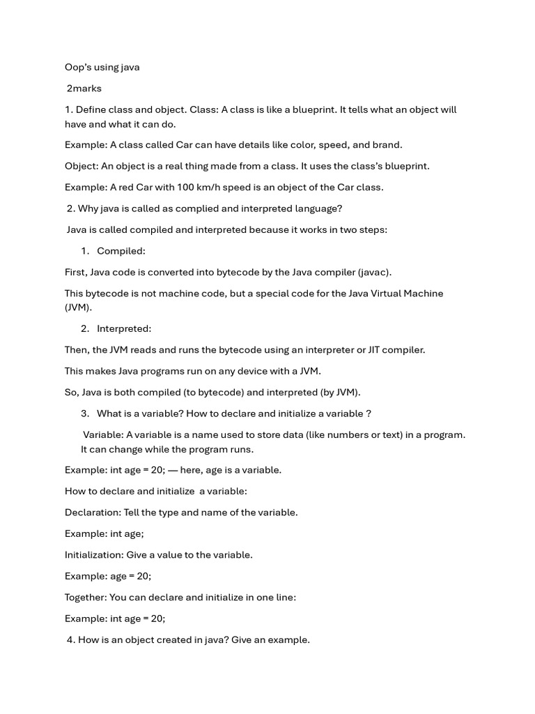 1. Define class and object. Class: A class is like a blueprint. It tells what an object will